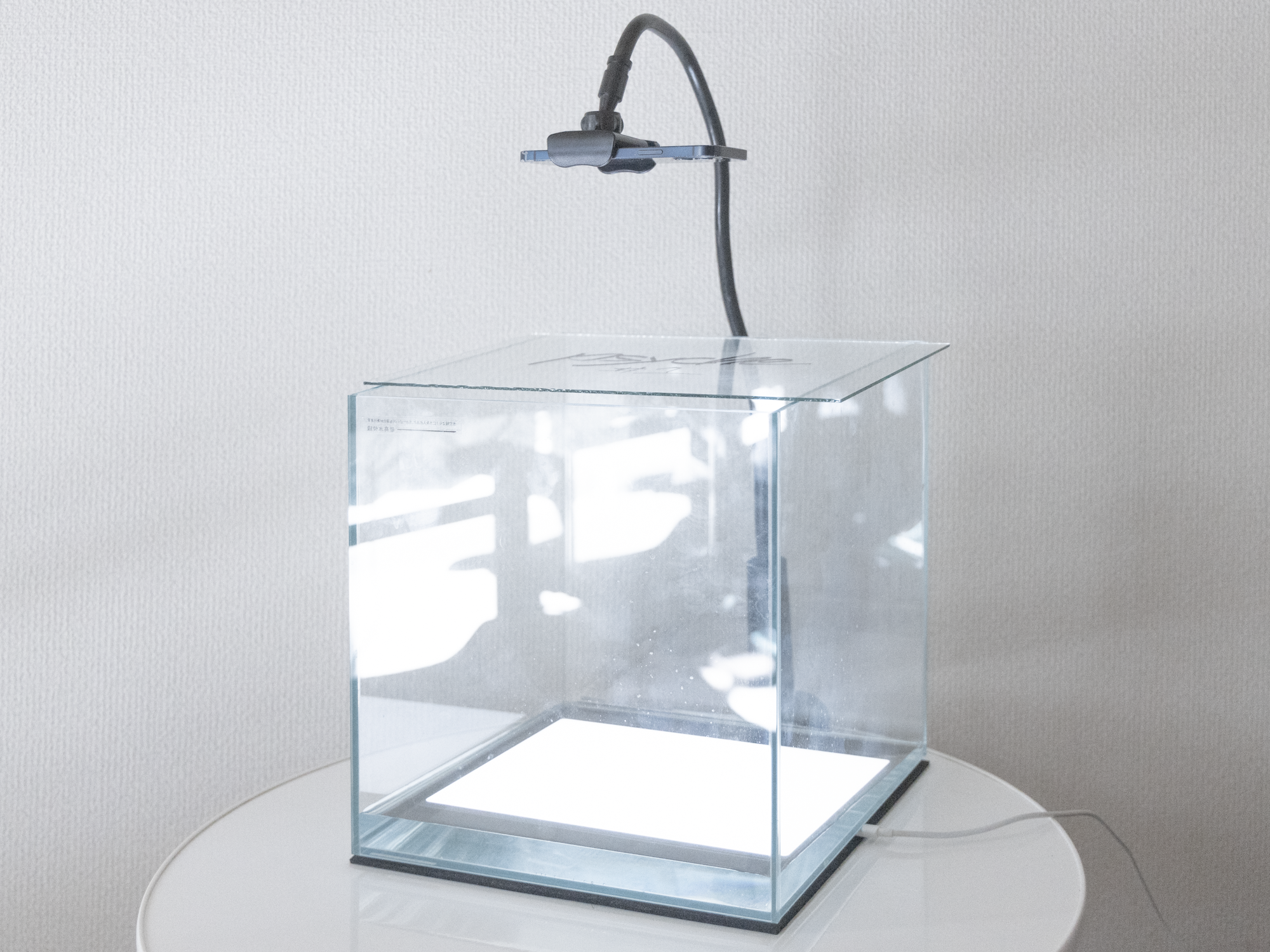 容器はiPadなどの16:9の薄型モニターの上に置かれ、映像が水を通りカメラに映るように調整します。