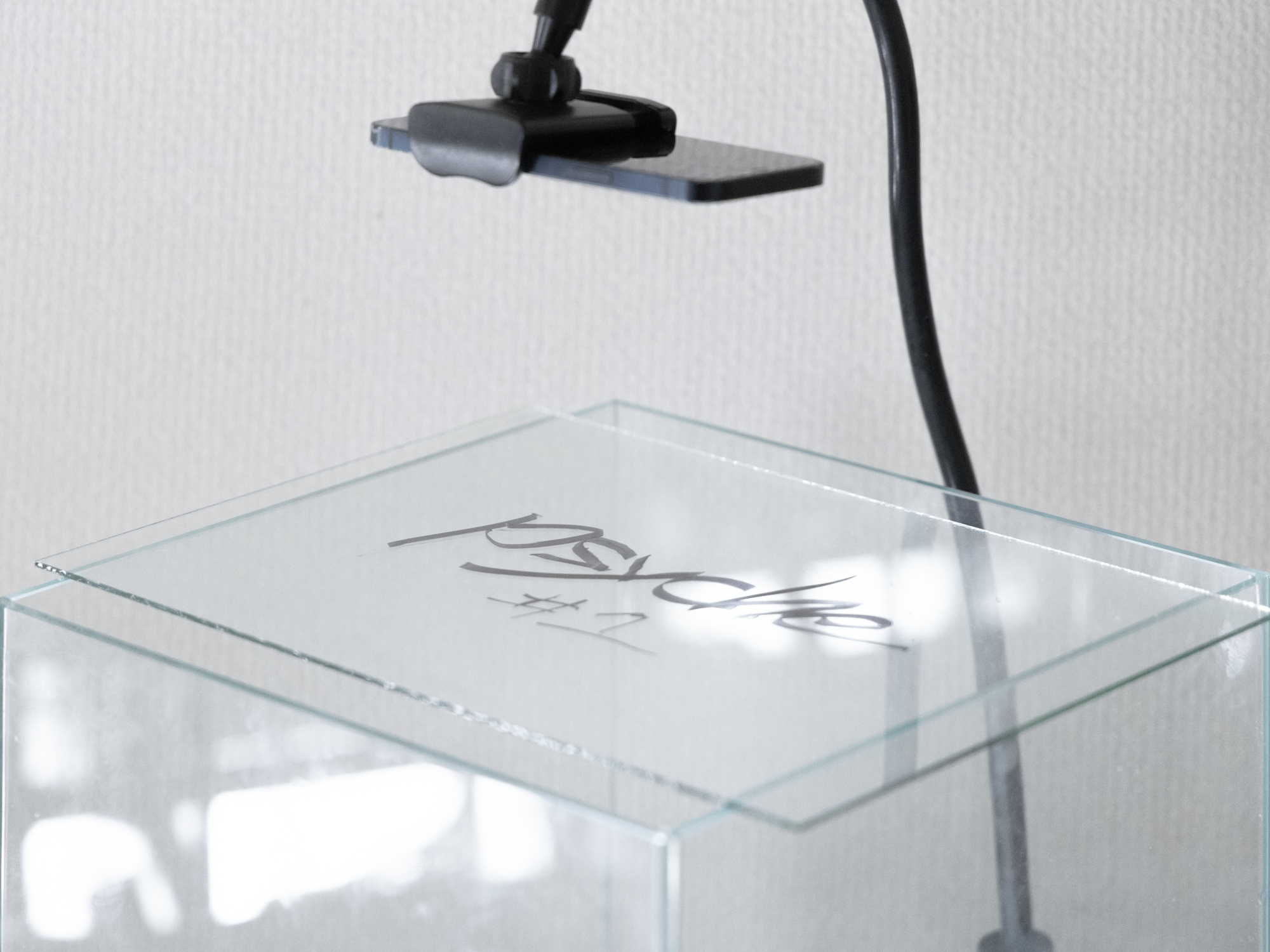 にっけいさんから提案頂いたのは「真っ白な部屋にただ水槽が置かれている画面」でした。最初は3DCGや実写で水槽をオブジェクトとして用意する予定だったのですが、話を聞いてみて、物体としての「アクリル板」すら透明である必要がでてきました。